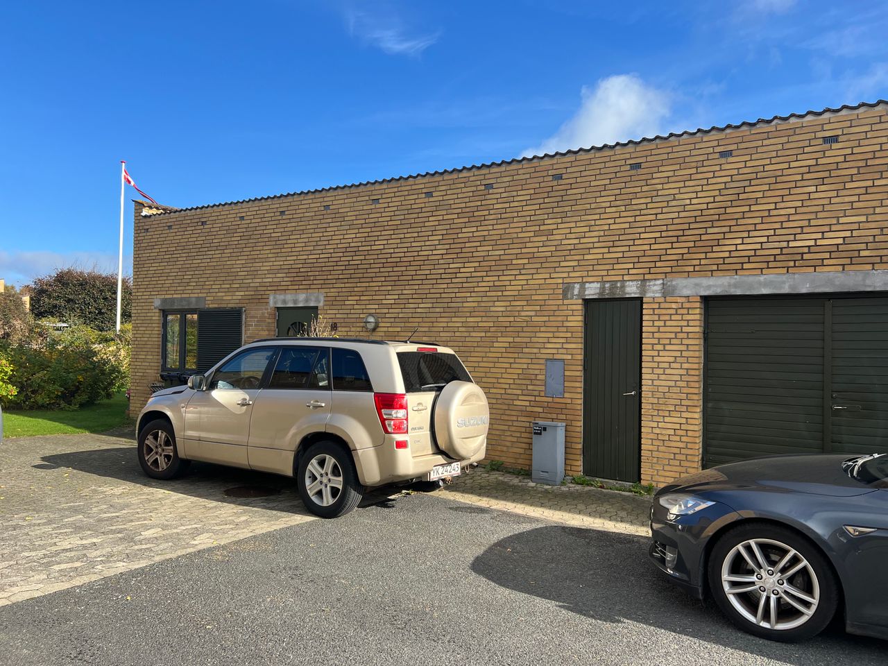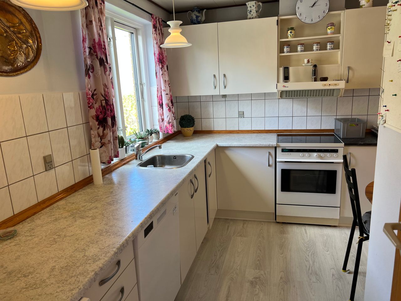 Køkkenet er fuldt udstyret med rigeligt med skabsplads og med opvaskemaskine, køle-/fryseskab, elkomfur, emhætte samt vaskemaskine. Endvidere soveværelse med skabe samt 2 mindre værelser. Dejligt brusebadeværelse. Direkte udgang til garage med udhus.